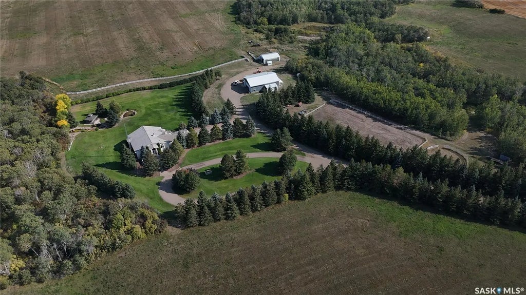 Welcome to your own private equestrian retreat! This breathtaking 79-acre property, a stone’s throw from the Battlefords, offers the perfect blend of luxury, comfort, & functionality. Whether you’re a horse enthusiast or simply seeking tranquility in nature, this pristine acreage promises the ultimate lifestyle. When you arrive, you’re greeted by a grand courtyard entrance, setting a tone of elegance. The open floor plan boasts abundant natural light, between living areas, making this home perfect for entertaining. A stunning three-sided fireplace with sunken seating is the centerpiece of the living space, providing warmth & ambiance on chilly evenings. This spacious four-bedroom, three-and-a-half-bathroom home is designed with both beauty & convenience in mind. The wet bar is perfect for hosting friends & family, while large entertainment areas—in & out—offer plenty of room for gatherings. The lower level has a feature wall, including a 75-inch Samsung frame TV with non-reflective screen that displays wall art when not in use, surround sound speakers are located on the wall & outside on the deck. The walkout basement extends your living space into the serene outdoors, where a beautiful pond & gazebo await, creating a backdrop for relaxation & peaceful reflection. The property is also a dream for horse lovers, with an impressive barn, stables, riding arena—everything you need to keep your horses in top shape & enjoy the equestrian lifestyle to the fullest. The tranquil surroundings, including the lush fields & serene pond area, create an ideal setting for both you & your animals. This is more than just an acreage—it’s a lifestyle. Whether you’re riding, relaxing by the pond, or entertaining guests in your beautiful home, you’ll experience the ultimate in country living & all the amenities you need. A 48x 40 heated shop also includes living quarters for a hired hand or a guest space for family and friends. The entry to the property has a large, controlled iron gate.