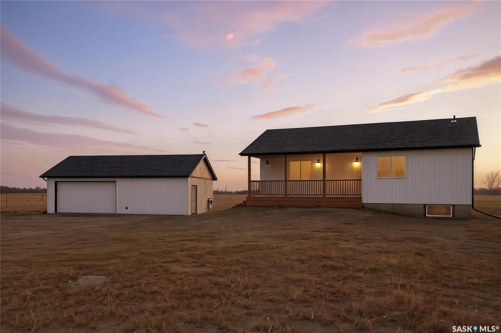 What an Opportunity! Just minutes west of Saskatoon—enjoy peaceful acreage living with city convenience! This newly constructed property sits on 3 acres and offers over 1,700 sq. ft. of developed space (902 sq. ft. on the main level), featuring 4 beds, two baths, a fully developed basement, and an impressive heated triple detached garage (36’ wide with a double overhead door). The home welcomes you home with a charming covered front porch and a functional large foyer complete with a built-in bench and a separate boot room area with floor-to-ceiling wardrobes. The open-concept main floor connects a spacious living room, dining area, and kitchen. The kitchen is a standout, showcasing an abundance of custom lacquer cabinetry, full-height pantry storage, quartz countertops, stainless steel appliances including a microwave hood fan, subway tile backsplash, and an oversized island ideal for large gatherings. The adjacent dining room easily accommodates a large table for the entire family! A convenient two-piece bath completes the main level. An open staircase leads to the bright lower level, which offers four bedrooms (one smaller—ideal as a nursery, office, or den), a spacious family-style 4-piece bathroom, and a large walk-in closet in the primary bedroom. Outside, the detached 36’ heated and insulated garage is a dream setup—complete with a workshop area and a double overhead door. The yard is unlandscaped but cleared and ready for your personal design—bring your garden plans and your green thumb. Property is built by a reputable experience Saskatoon builder.
